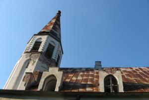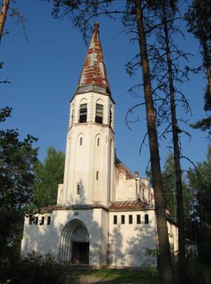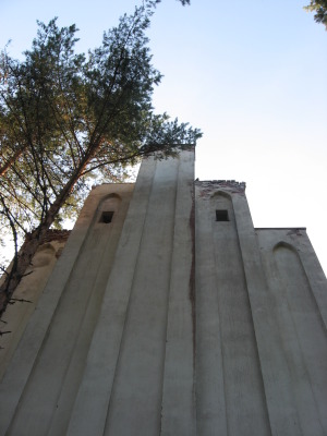 С запада кирхи — традиционная колокольня с кубическим основанием, в котором — центральный вход в неё, устроенный в виде углубляющегося в сторону основного помещения церкви (кафоликона) портала, как бы вводящего нас в храм ещё до того, как мы вошли под его своды. Этот своеобразный и оригинальный архитектурный элемент, на мой взгляд, одна из изюминок церкви.