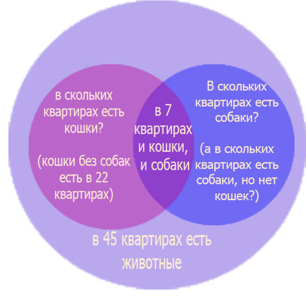 Собаки находятся в числе квартир, оставшемся после вычитания из количества всех квартир с животными количества квартир только с кошками. Круг с общим числом кошек состоит из известных данных секторов «только кошек» и «кошек и собак», поэтому общее число кошек находится объединением сумм этих секторов. Последнее неизвестное находится соответственно. Определенно, значительно проще объяснить решение этой задачи с помощью кругов Эйлера.