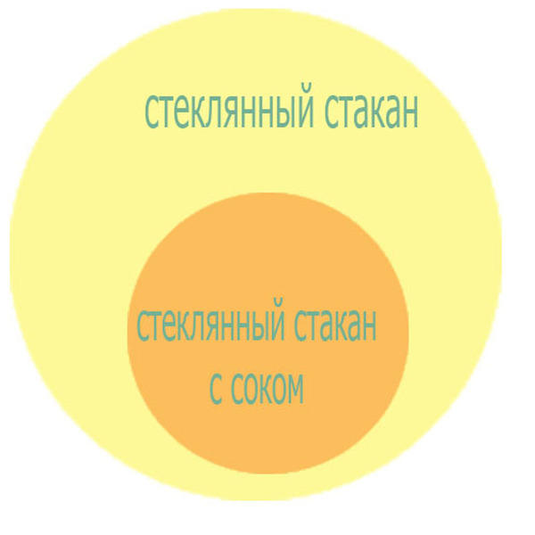 - Определить круги, которые подходят к описанию предмета. При этом желательно обратить внимание на те качества, которыми предмет обладает постоянно и которыми временно. Например, стеклянный стакан с соком всегда остается стеклянным, но сок в нем есть не всегда. Или существует какое-то обширное определение, которое включает в себя разные понятия, подобную классификацию тоже можно изобразить с помощью кругов Эйлера. Например, виолончель — это музыкальный инструмент, но не каждый музыкальный инструмент окажется виолончелью.