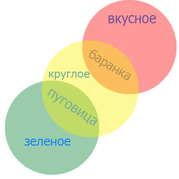 - Определение круга, который не подходит к описанию предмета. Например, баранка — она круглая и вкусная, а определение зеленая к ней не подходит. Можно также придумать, какой предмет подойдет для пересечения другой пары кругов. Пример — круглая и зеленая может быть пуговица.