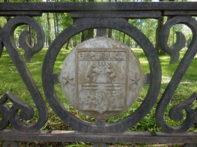 • На мой взгляд, отдельного упоминания заслуживает невысокая литая оградка привокзального сквера, в котором установлен памятник медицинским сестрам. Скорее всего, это своеобразное произведение искусства: продолговатые, приподнятые над землей литые прямоугольники, в которых, среди растительного орнамента, помещены круглые щиты. Через один в них - тот же растительный орнамент, отличный от самой ограды, но характерный для этой северной земли. Например, веточка сосны с шишкой. А через один между этими щитами, уже щиты с гербами Вологды и ВСЕХ районных центров области - Тотьмы, Устюжны, Кириллова, Белозерска... На жаль, не догадался сфотографировать их все. Поэтому только герб собственно Череповца в растительном орнаменте ограды.