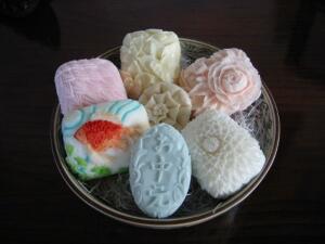 Из сырья я так ничего и не сделала, а вот эксперимент по расплавлению большого и неудобного куска мыла был. Расплавила, залила в формочки, но в процессе остывания и высыхания масса сжалась и брусочки получились деформированные и некрасивые, а потом быстро смылились, чуть ли не таяли под водой, как лед.