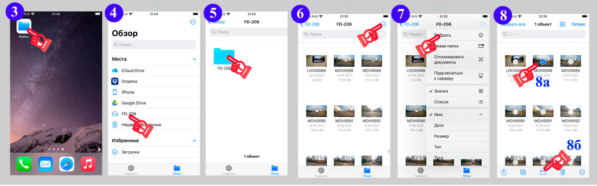 Шаг 10−11−12. Во вкладке «Обзор» касаемся строки IPhone, убеждаемся в наличии сохраненного видео и запускаем его для проверки.