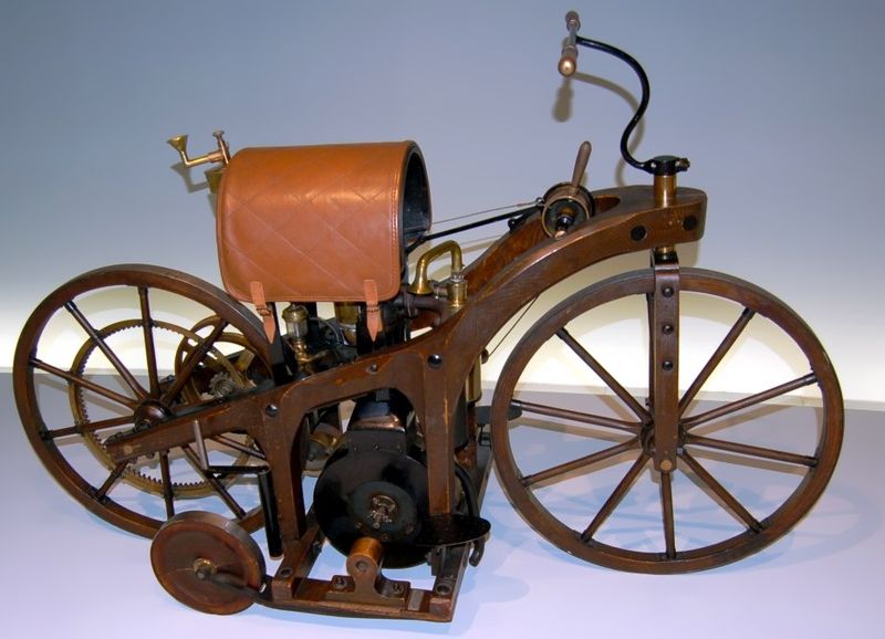 Изначальная версия железного скакуна обладала рамой, сделанной из дерева, и была на четырех колесах. В качестве топлива пользовались бензином или керосином. Эта чудо-техника могла развить скорость до 12 км/ч. Что правда, людей поначалу веселило это новейшее изобретение, но это был только старт для развития технологии и инженерной мысли.