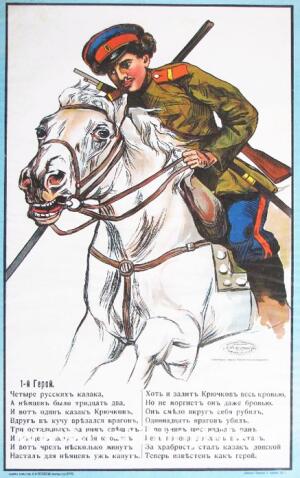 Пропагандистская кампания, развернутая вокруг имени Козьмы Крючкова, видимо, была призвана показать мощь русского оружия и убогость противника, тем более что пришлась она на время неудач русских армий в Восточной Пруссии. Некоторые исследователи полагают, что казаки в образе Крючкова воплощали «народный патриотизм» и были «более близки к народной аудитории по своему социальному облику». Однако такая агитация скорее навредила: для участников боев, главным образом пехотинцев, казак – это выскочка, не знающий ни шрапнельного огня, ни окопов, ни (позднее) газов, зато первым грабящий пленных и жителей, занимающий лучшие дома при квартировании, вечно торчащий в тылу и исполняющий полицейские функции. В тылу казак тоже воспринимался как слуга царя, его держиморда. Население городов и деревень еще помнило 1905–1907 гг., а те, кому тогда было по 10–12 лет (период формирования личности через восприятие окружающего мира), как раз и составляли основной контингент русской армии в Первой мировой войне.