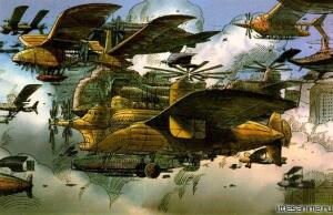 «Неожиданно невысоко над землей медленно проплыли тяжелые летательные аппараты с перепончатыми, как у птеродактилей, крыльями. В первый момент мне показалось, что все они горят, но затем я заметил, что дым у них идет из больших конических труб. Грузно размахивая крыльями, они летели надо мной, посыпалась зола, и кто-то уронил на меня сверху суковатое полено».
