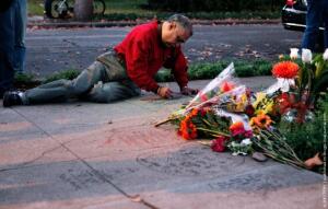 А на Мичигане уже не продохнуть — народ валит под магазин проводить Стивена под зажженную свечу, надкусанное яблоко, скорбный букет осенних цветов. Пишут записки, лепят их на витрины, а то и просто на асфальт. Детки оставляют свои игрушки, взрослые обнимаются, верующие молятся. Подгребают музыканты, тормозят машины и сотрясают Мичиган прощальными гудками. (Так гудели на гибель самолета перед польским консульством!) Продавцы эппловские тусуются в толпе горожан, принимают соболезнования. Им еще работать, а руки — плетью.