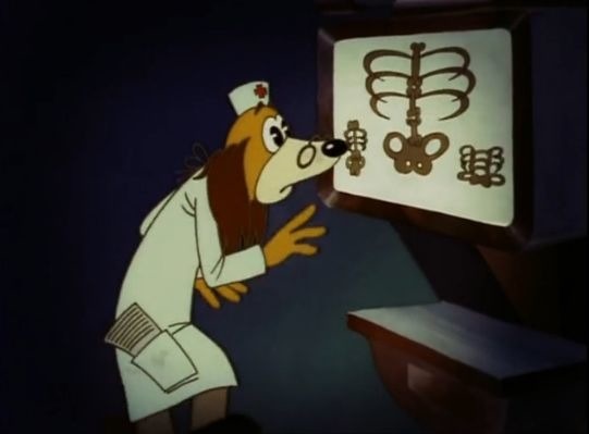 - А какой второй выход — подскажет старый мультфильм «Поликлиника кота Леопольда». В нём показана флюороскопия — метод рентгенодиагностики, при котором изображение получают не на плёнке, а в реальном времени на экране с люминофором.