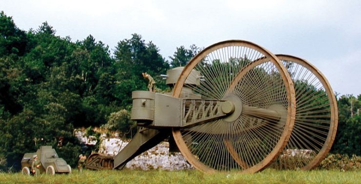 Еще большее удивление вызывает один из проектов, который разрабатывался в России. Машина эта, будь она реализована, использовала бы на двести процентов устрашающий эффект танков. Хотя танком с первого взгляда этот колесный экипаж назвать было бы трудно. Так же, как трудно было бы сохранить самообладание в бою, когда на тебя движется чудовище высотой с трехэтажный дом, поливая сверху все живое огнем двух пушек и десятка пулеметов. Девятиметровые колеса позволяют ему без труда преодолеть окопы и проволочные заграждения. Не остановить! А гром и искры выхлопов могучих двигателей заставляет вспомнить о мифическом Змее Горыныче. Или о тех самых шагающих бронированных мастодонтах из «Звездных войн».