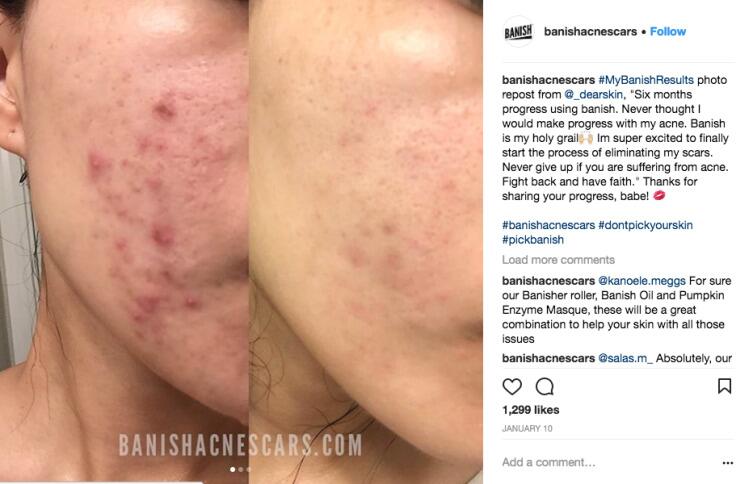 Такие бренды, как Banish, с успехом используют этот метод в социальных сетях. Они публикуют фотографии своих клиентов до и после использования своей продукции для устранения шрамов от акне. Таким образом, они взаимодействуют с уже существующими клиентами и наращивают интерес к своим товарам у новых пользователей.