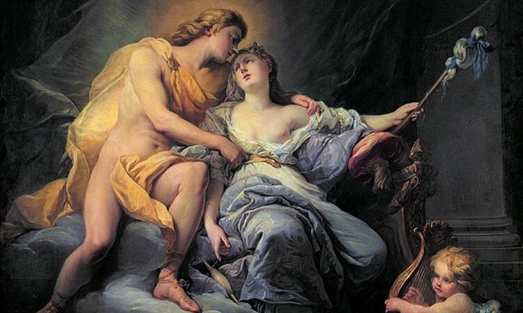 В картине французского художника Антуана Буазо (1702−1782 гг.) Аполлон бросил свои царские регалии на пол, его губы тянутся к лицу Левкотои с поцелуем, а правая рука пытается развязать поясок на платье девицы.