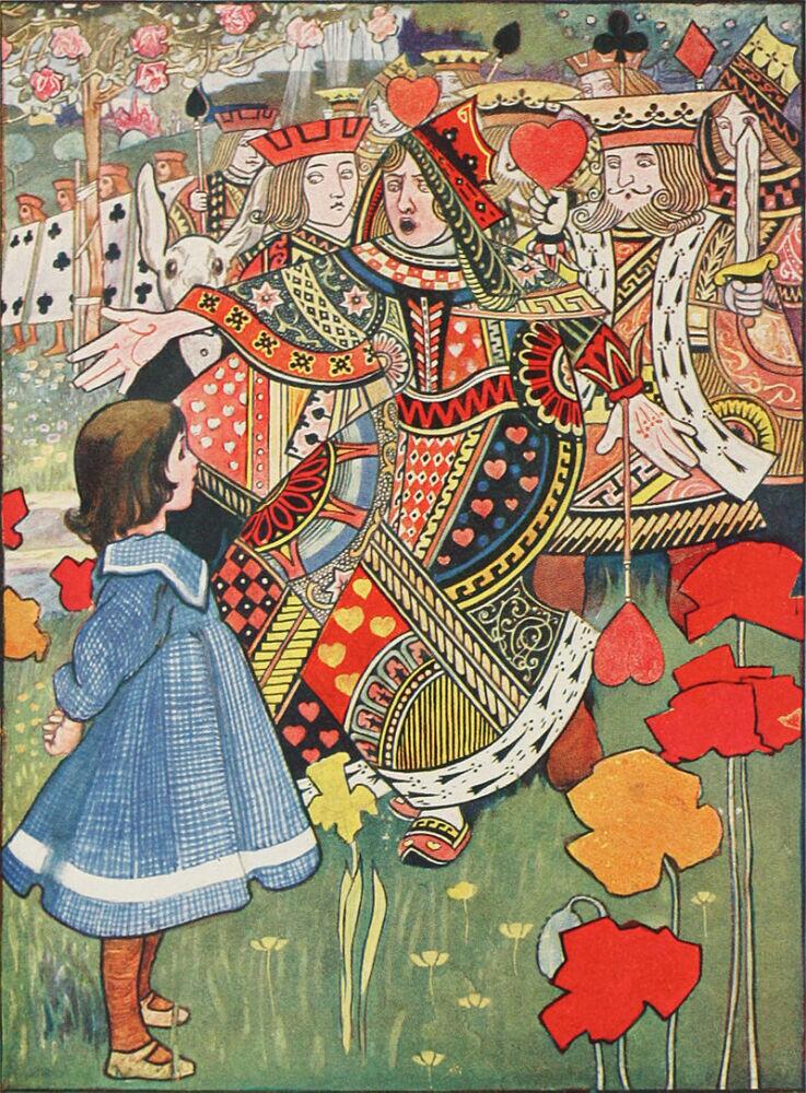 Попытки навязать «Алисе» социально-политические трактовки встречаются и сегодня. Например, доктор филологических наук Леонид Кацис в разных интервью с завидным постоянством утверждает, что Кэрролл недалеко ушёл от Свифта с его политическим памфлетом про Гулливера. Мол, в сцене суда над Валетом критикуется «островная» (т.е. британская) система судопроизводства — в противовес «континентальной». А желание Королевы Червей рубить направо и налево головы — отсылка к… Великой Французской революции (хорошо, что не Октябрьской)! То, что во время революций головы рубят не королевы, а королевам, Кациса почему-то не смущает.