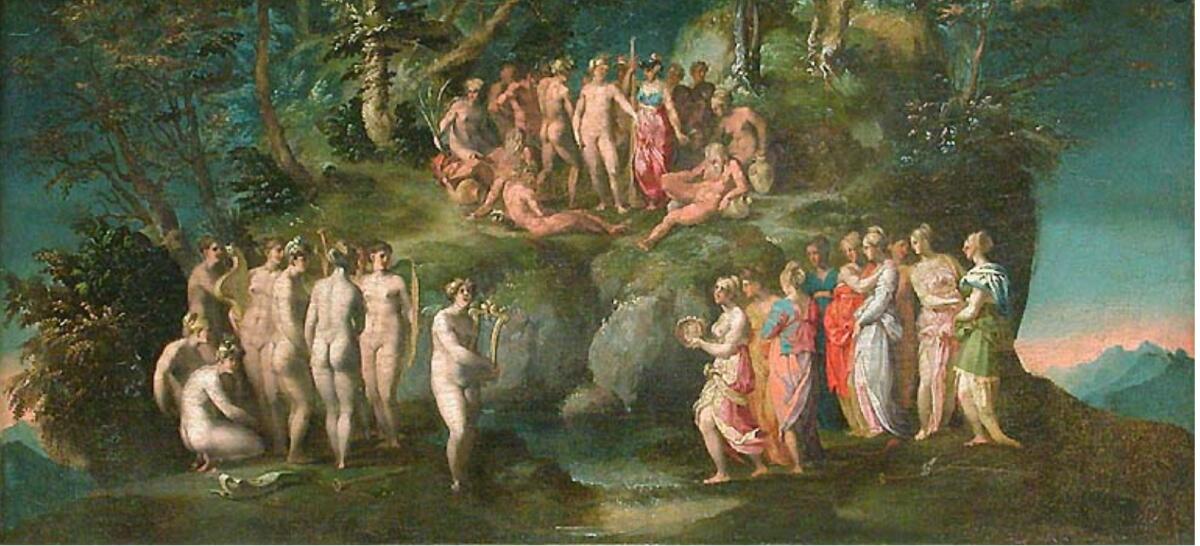 Итальянский художник XVI века Россо Фиорентино представил зрителю состязание: девять муз и девять неразумных девиц, судейскую коллегию-нимф, высоких гостей-богинь и богов. Музы — слева (как и полагается, совершенно обнаженные), девицы — справа, а судьи и гости — на скальных выступах.