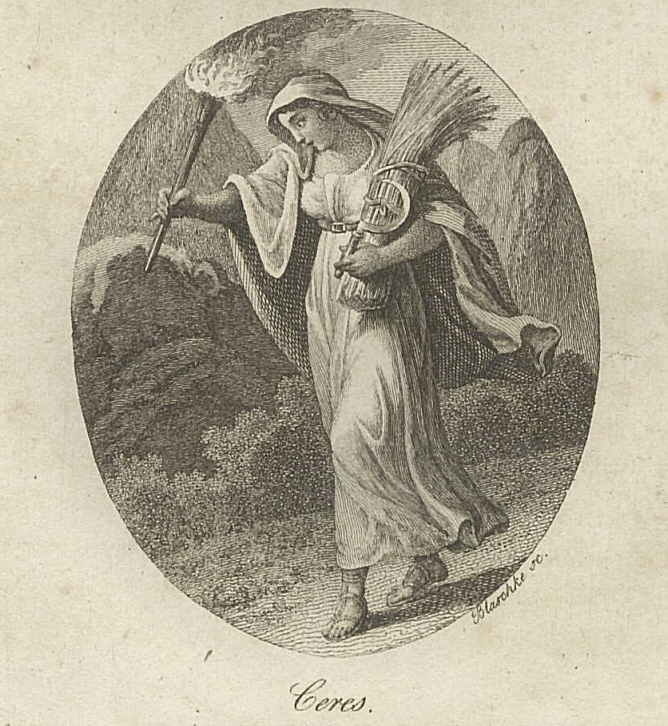 Австрийский художник Ян Блашке (1770−1833 гг.) изобразил бредущую в темноте с факелом Цереру. Символ ее божественной силы — плодородия — сноп пшеницы в левой руке и серп.