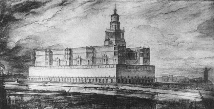 Не стану в подробностях разбирать ни идею Дворца Советов, ни историю его так и не завершенного строительства. Сейчас — о его роли в радикальной смене архитектурного стиля в СССР.