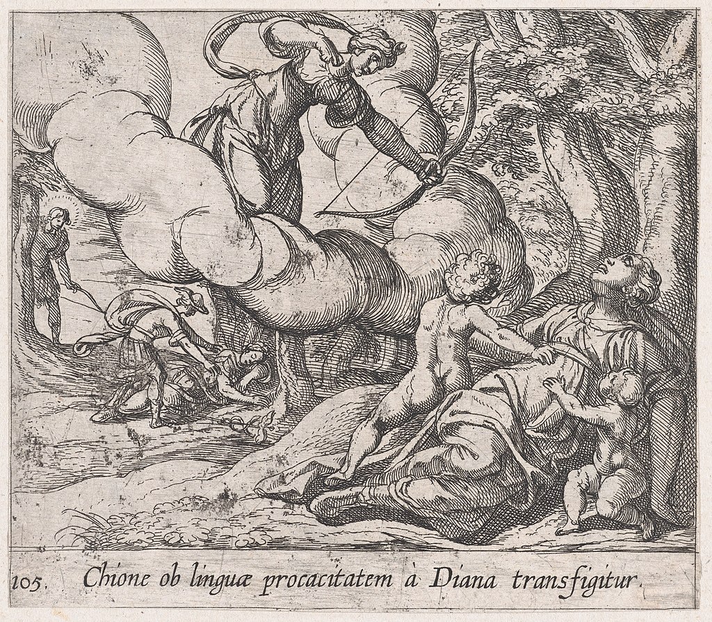 Итальянский художник Антонио Темпеста в своей гравюре к «Метаморфозам» Овидия отразил события древнегреческого мифа о Дедалионе. Слева у края рисунка с луком в руке — Аполлон, который ждет наступления ночи, чтобы беспрепятственно соединиться с Хионой. Чуть правее — над телом спящей девушки согнулся Гермес: он только что усыпил Хиону. В правом углу лежит мертвая Хиона, возле нее — ее дети. Наверху в облаках — Диана, она только что выпустила из лука смертельную стрелу.