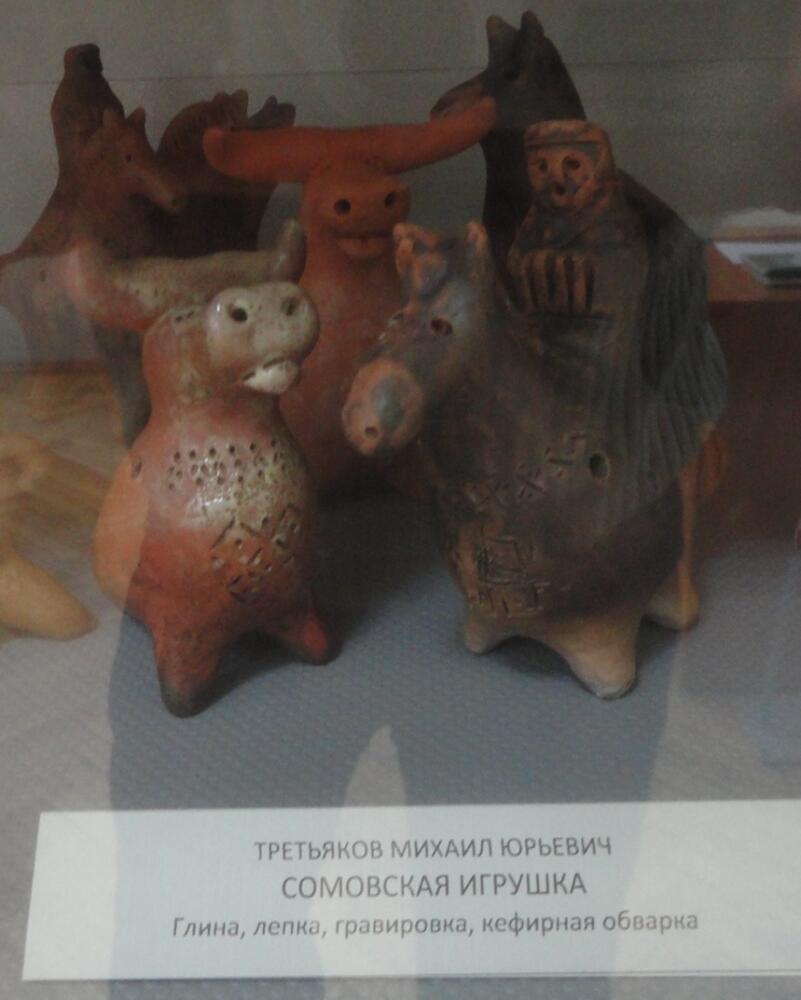 И уже на первом этаже, в той части экспозиции, что посвящена декоративно-прикладному искусству — росписи по дереву, кружевоплетению и плетению из бересты, резьбе по дереву или кости. Вот там… Стоят и глиняные игрушки. Такими небольшими группками. И возле каждой — табличка с пояснительной надписью. «Филимоновская игрушка». «Игрушка Коми». И вдруг… А это что такое?! «Старооскольская (!) игрушка». И за табличкой — знакомые с детства свистульки. Птички. Баранчики.