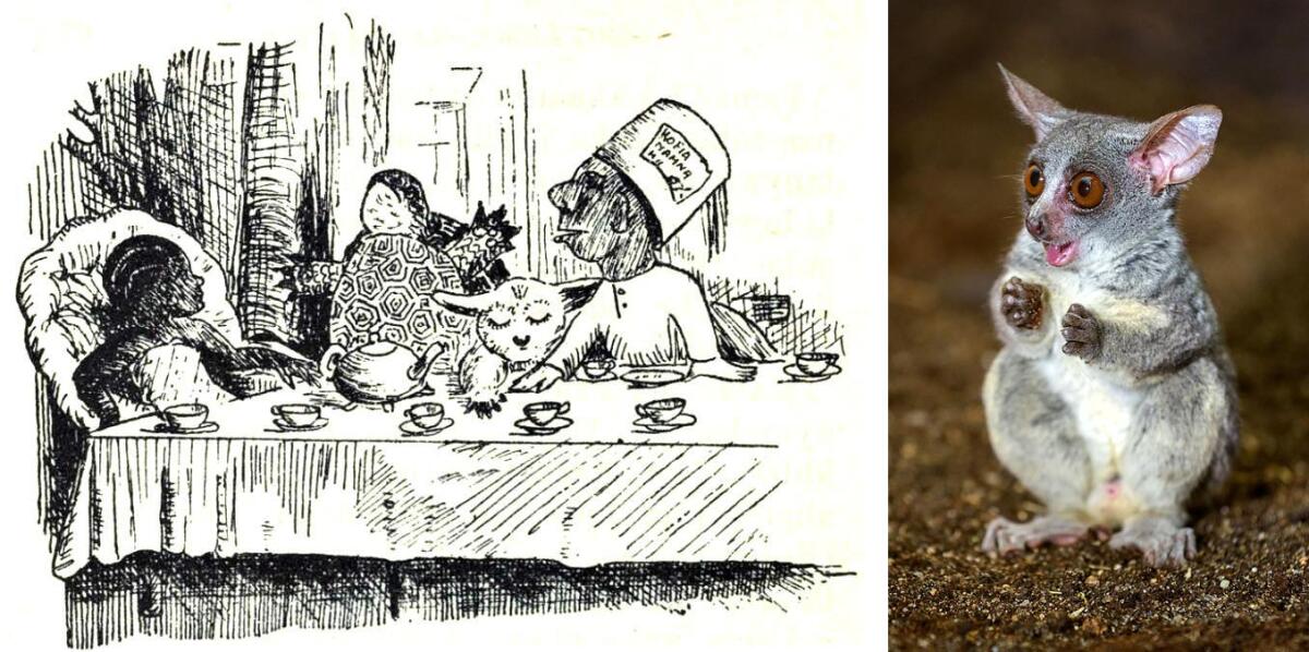 Изменились и участники Безумного Чаепития. Если Шляпник всего лишь превратился в чернокожего Продавца Шляп, то на месте Мартовского Зайца мы видим Черепаху, а на месте Сони — Галаго. Галаго — эта родственник лемуров, этакая забавная полуобезьяна с большими глазами и оттопыренными ушами. На суахили зверька зовут «Komba», и, как оказалось, такой выбор не случаен. Галаго очень любит лакомиться пальмовым вином, поэтому слово «комба» на местном жаргоне означает ещё и пьяницу. Поэтому, как и Соня, этот герой сказки постоянно находится в осоловелом сонном состоянии.