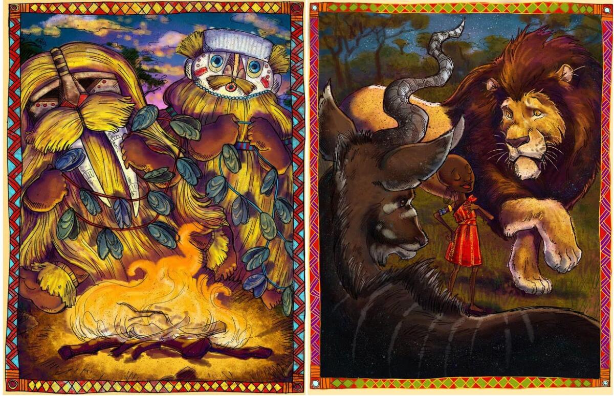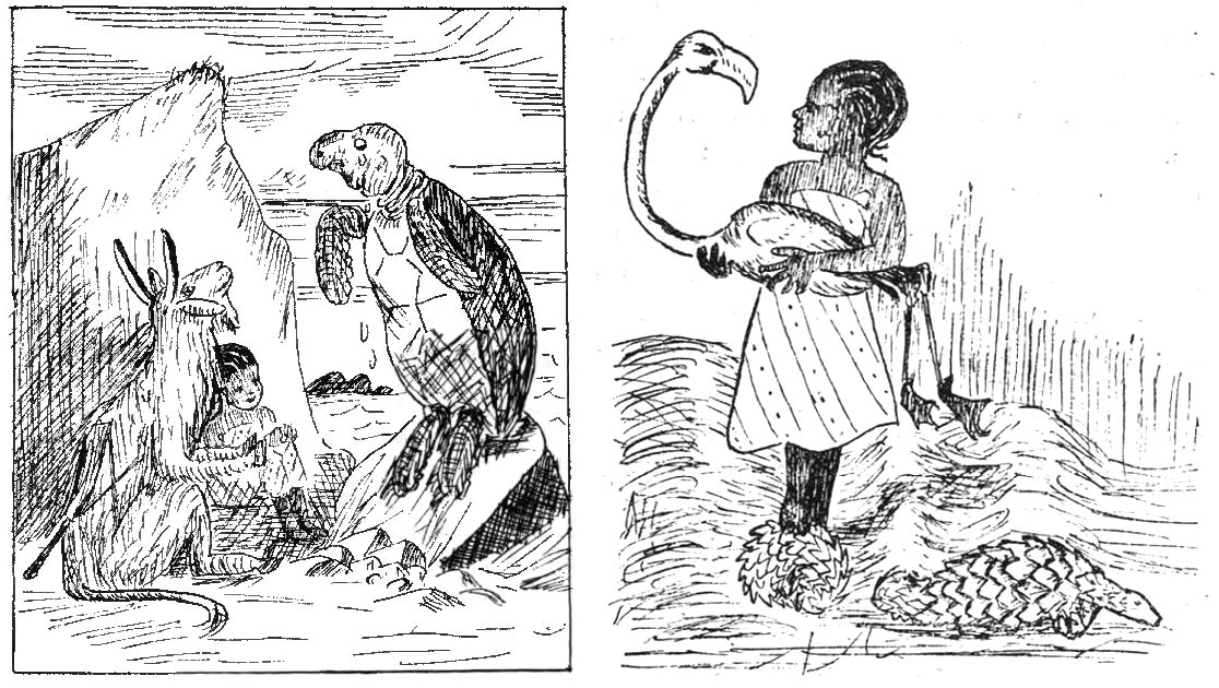 Жилища и детали быта тоже по-африкански аутентичны. Если у Тенниела Белый Кролик падает и разбивает стекло теплицы для огурцов, то здесь роль теплицы играют керамические кувшины.