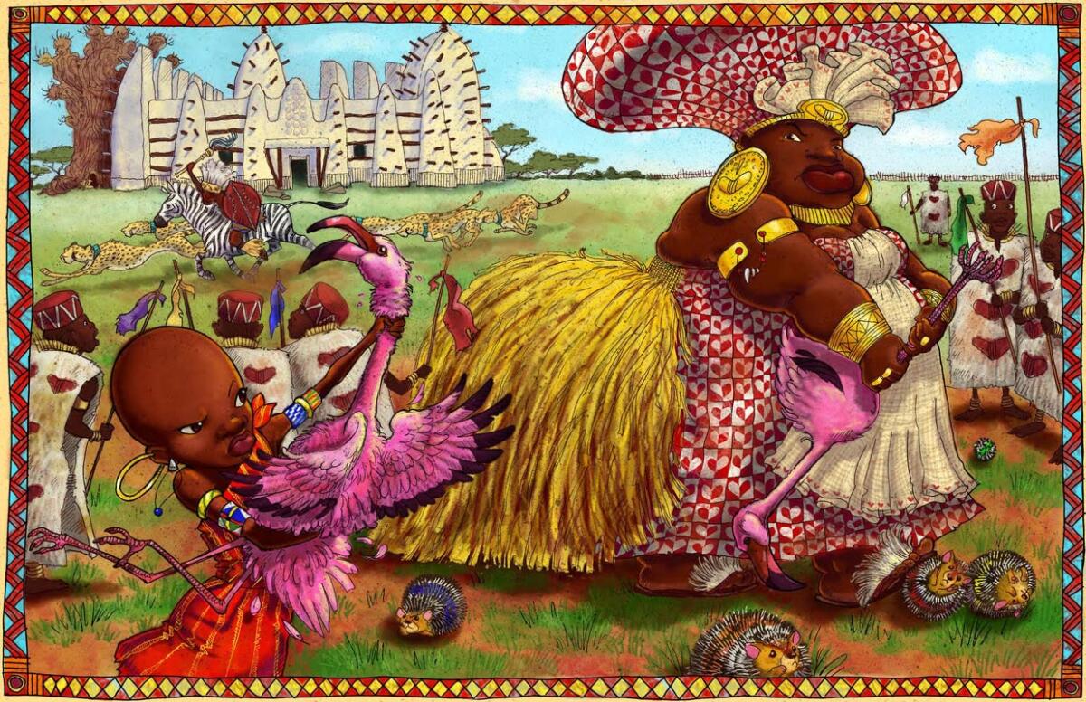 Королева Червей на рисунках выглядит вполне по-африкански — но, в отличие от жены вождя пигмеев, обладает солидными габаритами. А вот игра в крокет не особо изменилась — в ней так же бьют фламинго по ежам.