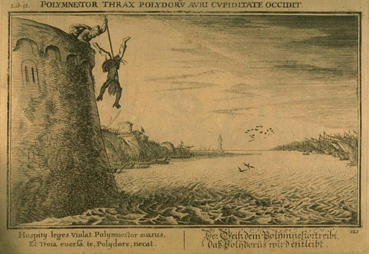(Приам отдал своего сына Полидора зятю, фракийскому царю Полиместору, чтобы избавить его от участия в военных действиях. Казалось бы, что может быть надежнее — быть в семье своей сестры. На деле все оказалось намного трагичнее…)