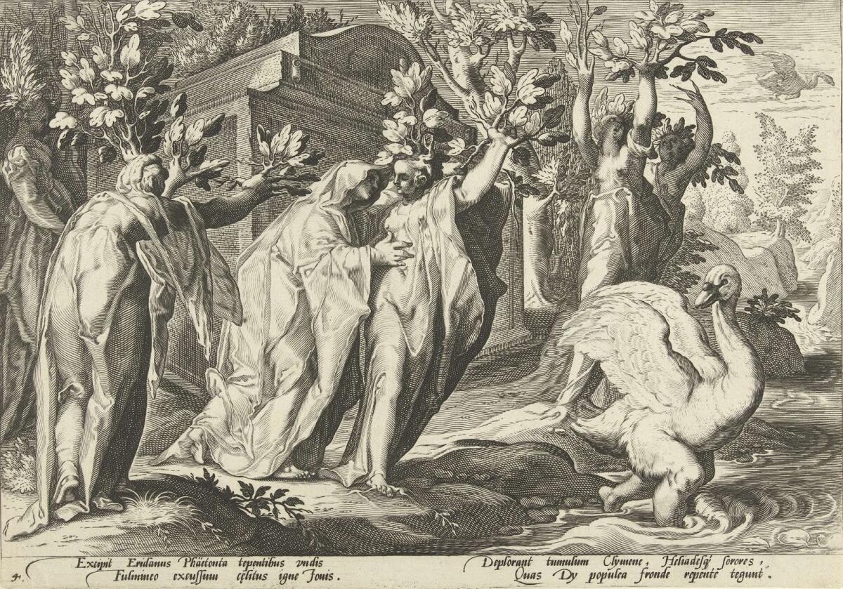 Кикн царствовал в Лигурии, но когда узнал о несчастии с Фаэтоном, бросил всё и прилетел к сёстрам. Вместе с ними он скорбит об участи Фаэтона.