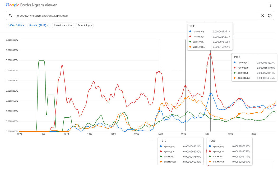 4 мая 1961 года вышел закон «Об усилении борьбы с лицами, уклоняющимися от общественно-полезного труда и ведущими антиобщественный паразитический образ жизни». Для простоты субъектов этого закона стали называть тунеядцами. Закон сопровождался волной статей и книг о борьбе с тунеядцами, благодаря которым в районе 1963 года можно наблюдать второй пик в употреблении этого слова в русском языке.