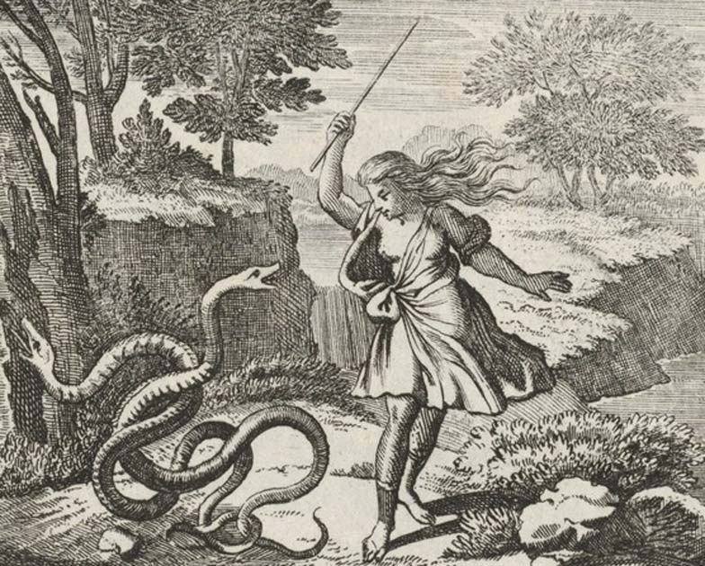 На гравюре Тиресий — еще женщина (длинные волосы и хорошо развитая грудь). Минута — и он обратится в мужчину…- а разум похоже у него мужской был. Девочка к таким змеюкам не полезла бы.