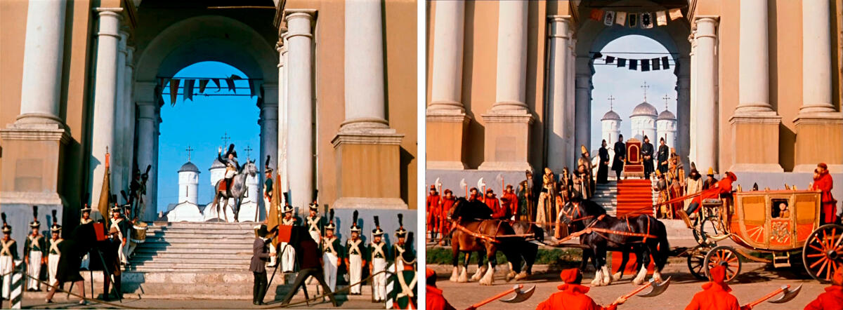 В сценах фильма, снятого с другого ракурса, в направлении с востока на запад, в проеме колокольни видны купола Ризоположенского собора середины XVI века, который в его полном великолепии можно увидеть на сделанном с высоты Преподобенской колокольни фото: