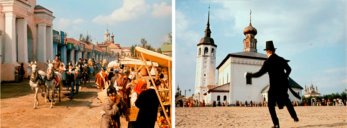 Очень колоритно насыщены видами суздальских храмов мечтательные сны Миши Бальзаминова.