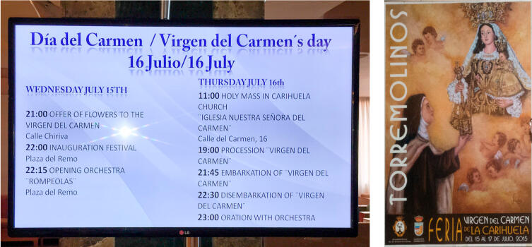 Католический праздник в ее честь эффектно и помпезно проходит в рыбацком квартале Торремолиноса — Карихуело, и близлежащем городе Беналмадене, где есть церкви в честь Девы Кармен.