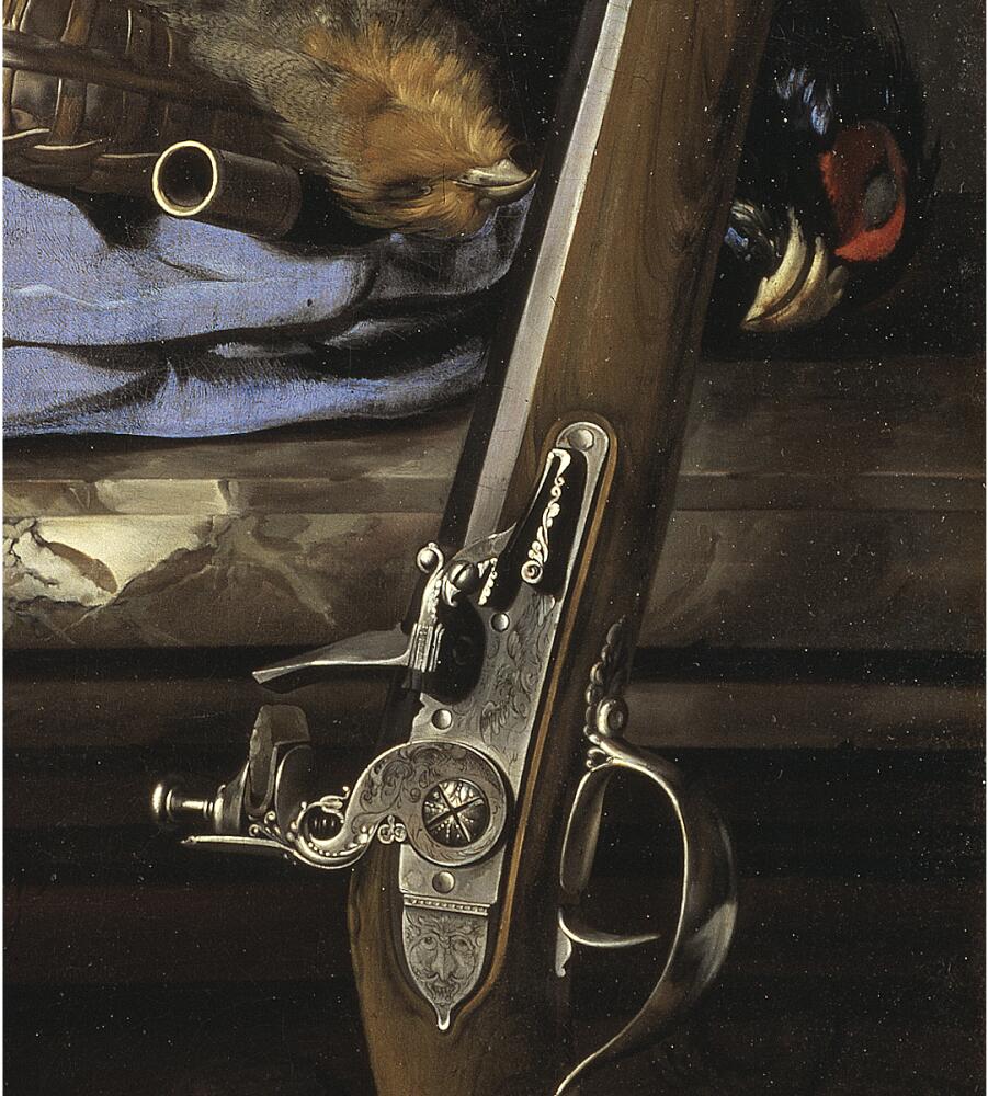 Меня заинтересовал «Фрагмент Ружья». В те времена многие художники становились художниками пройдя «стажировку» у ювелиров и многие оставались ювелирами уже становясь профессиональными художниками. Поэтому они так тщательно выписывали ювелирные украшения, что по их картинам можно было делать (и делают до сих пор) копии этих украшений. Не знаю, был ли художник ювелиром, но почти наверняка гравером. Невероятно, что человек, не работающий со штихелем, мог так точно и с такими нюансами выписать гравировку. Да и в мушкетах художник знал толк. Я вымерил замок мушкета – до миллиметра всё совпадает – кремень бьёт точно по полке с порохом, и кремень правильно крепится между куском кожи . У нас есть энтузиасты, охотящиеся с такими же кремневыми мушкетами https://www.youtube.com/watch?v=5ZFDomVXS0w