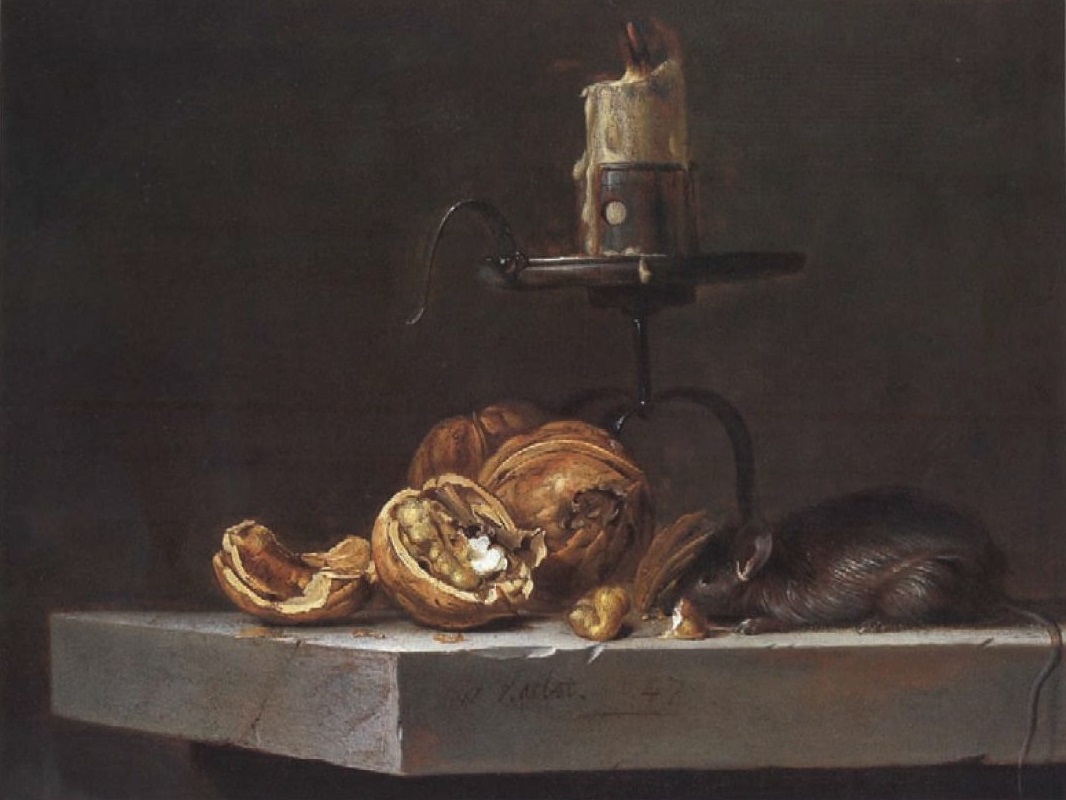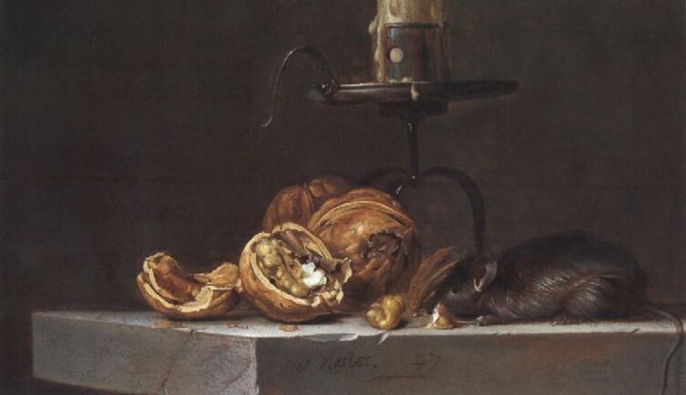 Подсвечник, свеча с тлеющим фитилем, пара грецких орехов, один орех расколот и кусочки ядра лежат рядом. Возле орехов лежит крупная мышь. Расположено это на столешнице из камня, виден скол на ребре.
