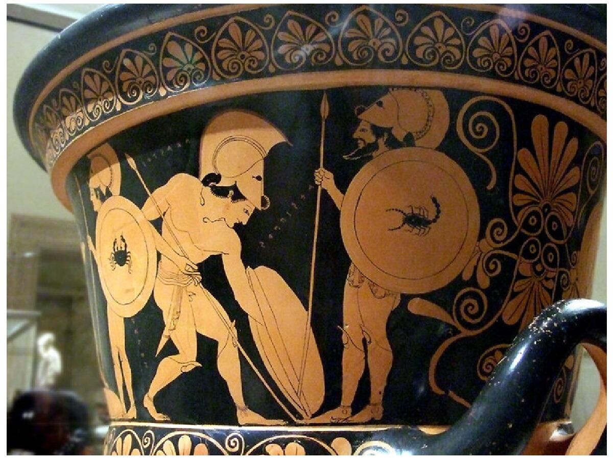 Щит, копья, шлемы. Терракотовая чаша для питья, 515 год до н.э., подписана: гончар Эукситеос, художник Эуфрониос, Аттика, Греция. Метрополитенмузей, Нью-Йорк, США