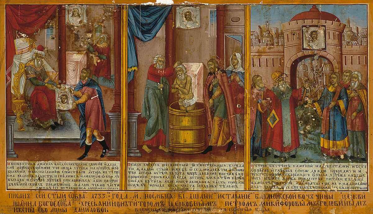 Согласно библейскому преданию, во времена земного жития Иисуса в городе Эдесса правил царь Авгарь, который тяжко болел проказой. Прослышав про чудесные исцеления, которые дарует Мессия, правитель отправил к Нему придворного живописца, который должен был передать Христу послание с просьбой об исцелении либо же написать портрет Спасителя.