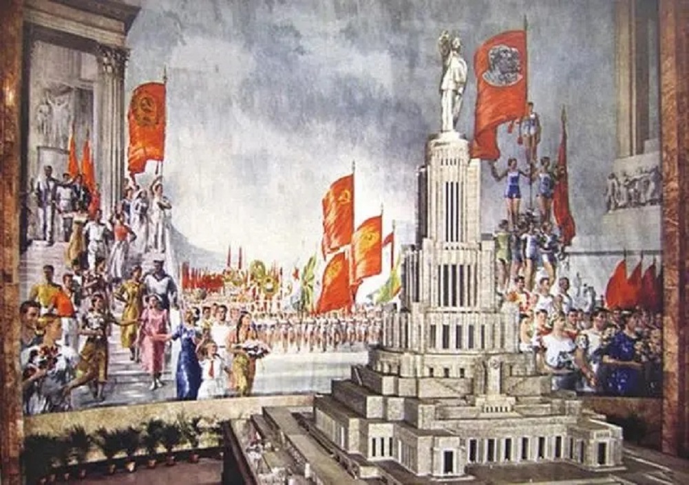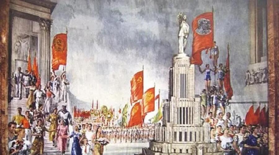 А вот еще одна «Новая Москва», она же «Физкультурный парад» — шестиметровое панно, служившее фоном для макета Дворца Советов на Нью-Йоркской градостроительной выставке 1939 года.