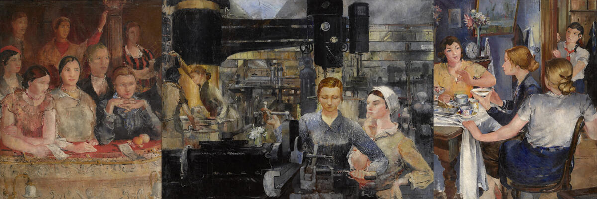 Выставка охватывает все периоды творчества мастера. И вот его девушки 30-х на триптихе «Работницы Уралмаша»: за работой, за чаепитием, в ложе театра. Та же индустриальная тема, что в 20-е, но стиль совершенно другой.