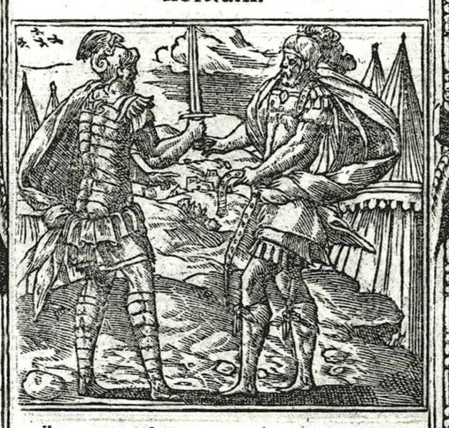 Андреа Альчато, «Гектор и Аякс обмениваются подарками», гравюра из «Книги эмблем», 1591 г. Слева — Гектор передает Аяксу меч, справа — Аякс держит в левой руке пояс