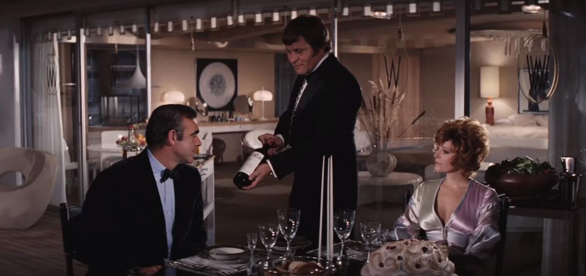 Фигура эксцентричного промышленного магната Уилларда Уайта, создавшего бизнес-империю, которую присвоил себе Блофельд (его образ воплотил популярный актер и певец Джимми Дин), первоначально показалась мне курьезной и, пожалуй даже, достаточно нелепой. Согласно сюжету, мистер Уайт неожиданно для всех стал отшельником и на три года уединился в пентхаузе на верхнем этаже роскошного отеля в Лас-Вегасе, который превратился в штаб-квартиру, откуда он руководил своей бизнес-империей. То есть всем казалось, что он ею руководит, потому что на самом деле всем заправлял Блофельд. Уайт же стал узником, живущим на пригородной вилле под присмотром симпатичных, но крайне опасных дам.