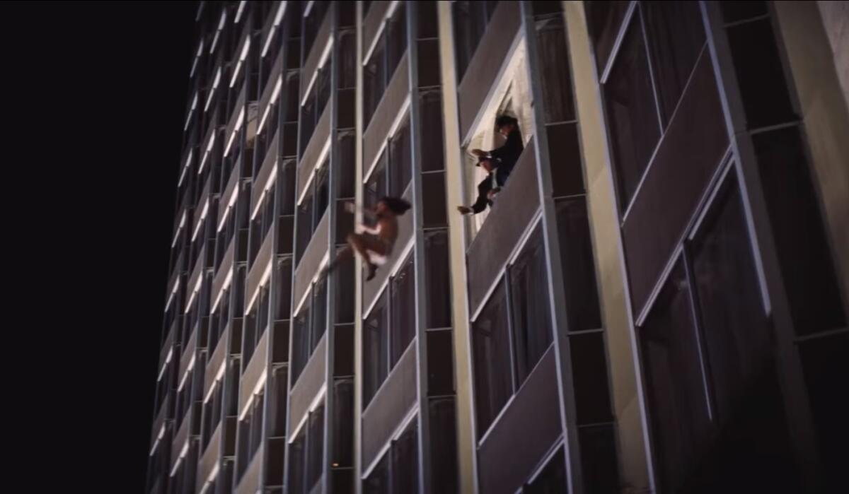 Гангстер выкидывает сопротивляющуюся Пленти из номера Бонда. Всем кажется, что она разбилась, но Бонд, выглянув из окна, видит барахтающуюся в бассейне Пленти и не может удержаться от того, чтобы не произнести: