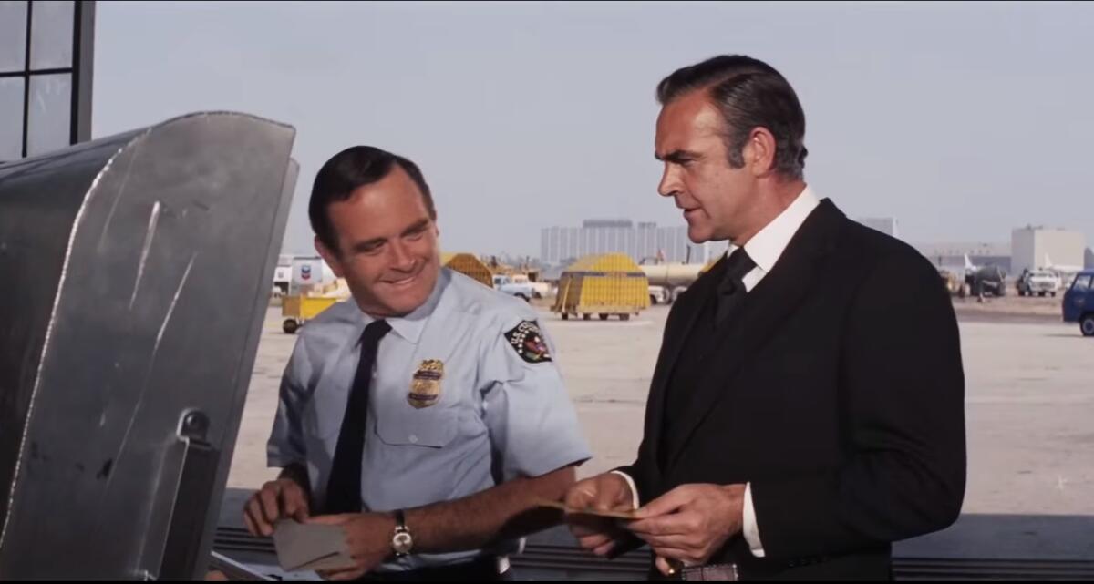 Феликс Лейтер встречает Бонда в Америке на таможне. Он предупрежден, что тело Франка использовалось в качестве контейнера для перевозки бриллиантов, но, как и в большинстве случаев, потерпел неудачу.