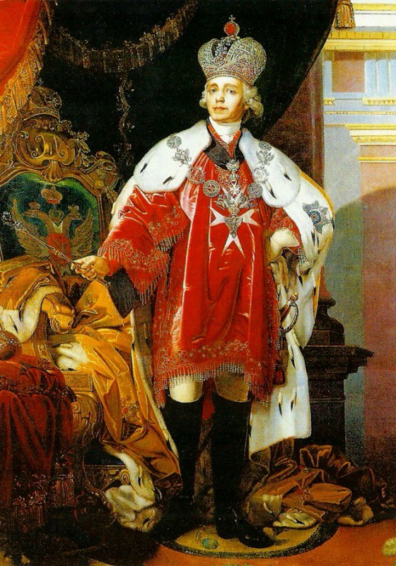 Вот тут все нормально: и корона, и императорская мантия, и красное одеяние гроссмейстера Мальтийского ордена, и Орден Святого Иоанна Иерусалимского (небольшой крест, увенчанный короной, висящий на груди императора), и скипетр в руке, и небрежно брошенная держава (вон там, слева от императора, лежит на подушке).