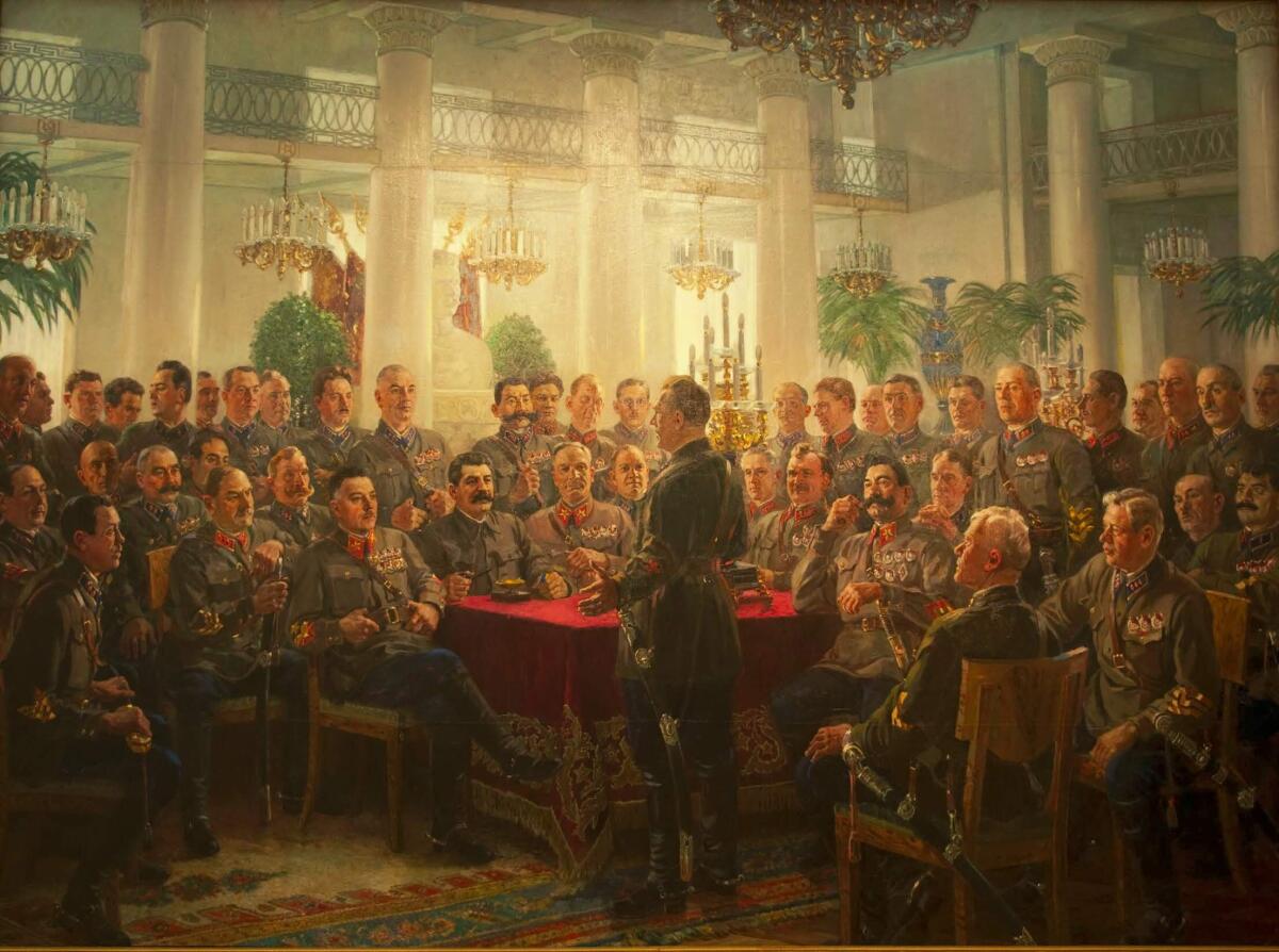 Вот, например, едва ли не главная картина довоенного СССР: «Сталин и Ворошилов в Кремле», Александр Герасимов, 1938 год.