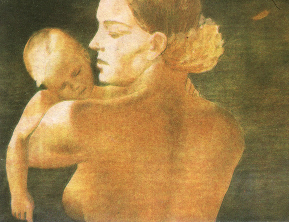 Эта вещь явно перекликается с работами Микеланджело. Неспроста Дейнека берет Микеланджело за образец. Это мать, но взгляните — какая. Женщина, но с явно мужской спиной. Да и обращена она к нам спиной, «силовой» стороной тела… Это «два в одном» — одновременно и кормящая мать, и защищающий отец.