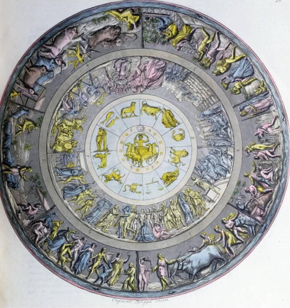 Еще один пояс — землепашцы гонят плуги, жнецы убирают урожай, за всем этим наблюдает царь, а под тенью дуба готовится трапеза: заколот бык, женщины месят тесто… Здесь же — стадо коров, на которое напали львы, пастбище и загоны для скота, и посередине — площадка для танцев с юношами и девушками. В толпе вокруг танцующих — певец и флейтисты. Последний пояс — Океан.
