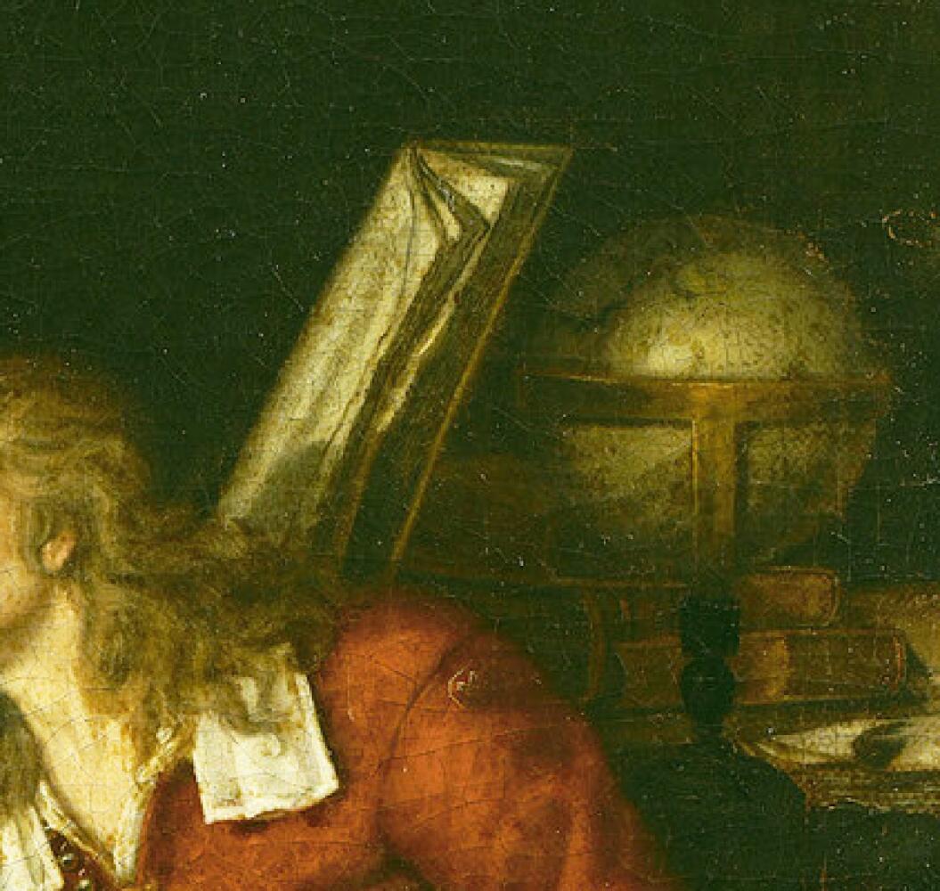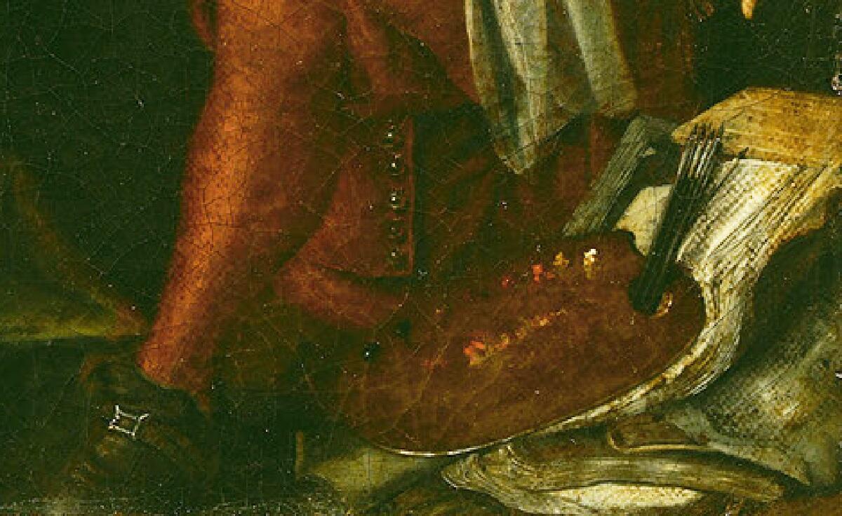 В правом нижнем углу — коленопреклоненный юноша, почти мальчик. Он аккуратно одет, длинные волнистые волосы спадают на плечи. Его глаза с мольбой обращены на сидящую напротив женщину. Под его левой рукой — кисти, палитра. Рукава подвернуты, за поясом — большая тряпка. За его спиной — стол с книгами и глобусом.