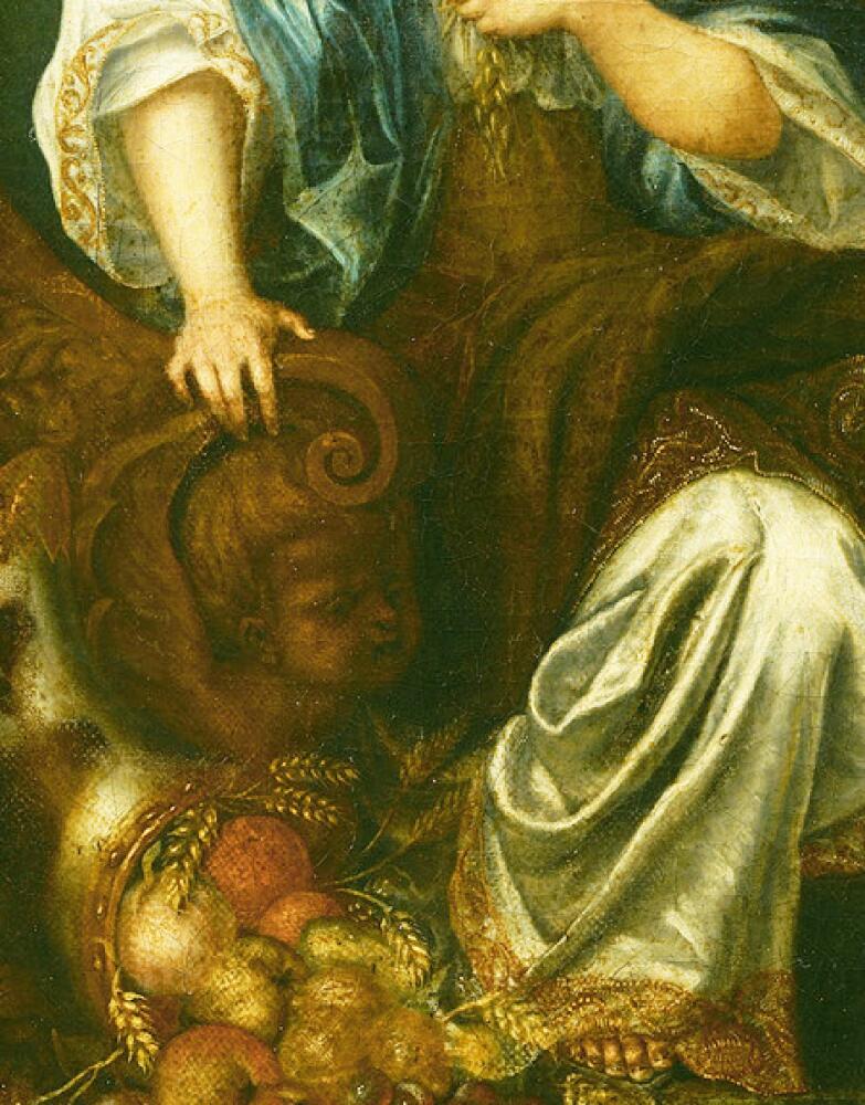 Символично, что голова — под рукой властной женщины, это как бы намек на то, что сиротский приют не дает свободы выражению чувств. В сочетании с рогом изобилия под той же рукой этот фрагмент может быть истолкован так: «Строгое воспитание приведет к благоденствию». С другой стороны, лицо ребенка — как бы воспоминание юноши о не очень приятных годах жизни.