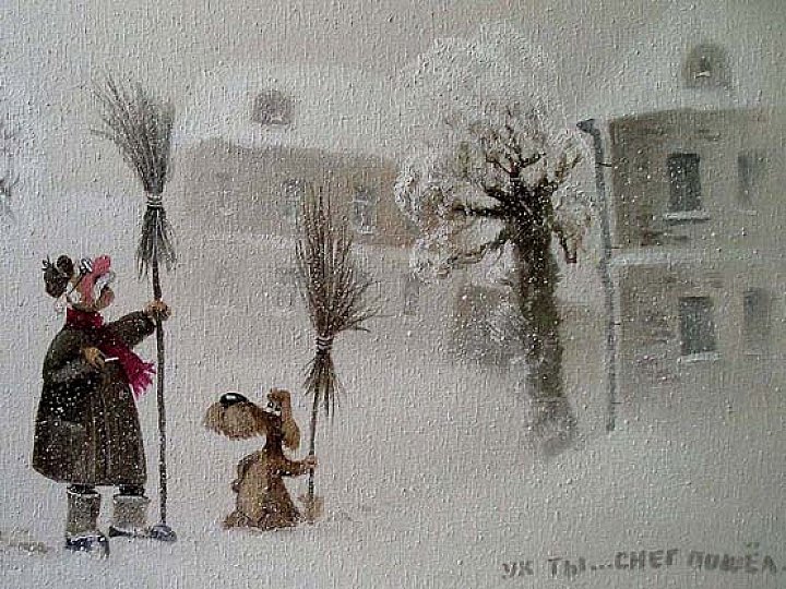 И конечно, чаще всего дворник оказывался на картинах в образе… собственно дворника. То есть во время работы, с метлой и лопатой.