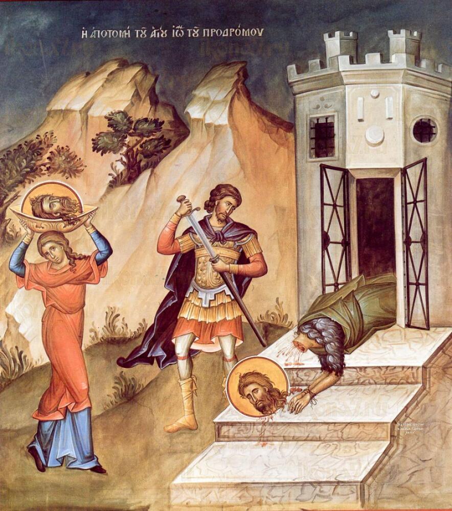 А вот икона на эту же тему. Тут одновременно изображены два события: собственно отсечение головы и Саломея, несущая ее матери. Для иконы подобное, одновременное изображение последовательно происходивших событий, нормально. Это рассказ, повествование… мы назвали бы это «комиксом»: на одном рисунке голову отрубают, на следующем ее несут на подносе. Мы с таким еще будем сталкиваться, это довольно обычная особенность средневековой живописи.