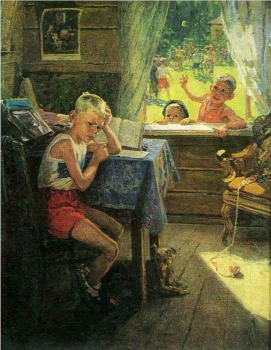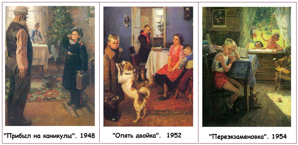 Вот три картины, объединенные… не факт, что общим персонажем. Скорее общей моделью. Хотя бы потому, что главный герой самой первой работы — суворовец. Второй — видимо, обычный школьник. Но даже абстрагировавшись от этого… вы верите, что бравый суворовец и двоечник — один и тот же мальчишка? Вот в то, что герой «Двойки» и через два года («Переэкзаменовка», 1954 год) завалил экзамен, верится.